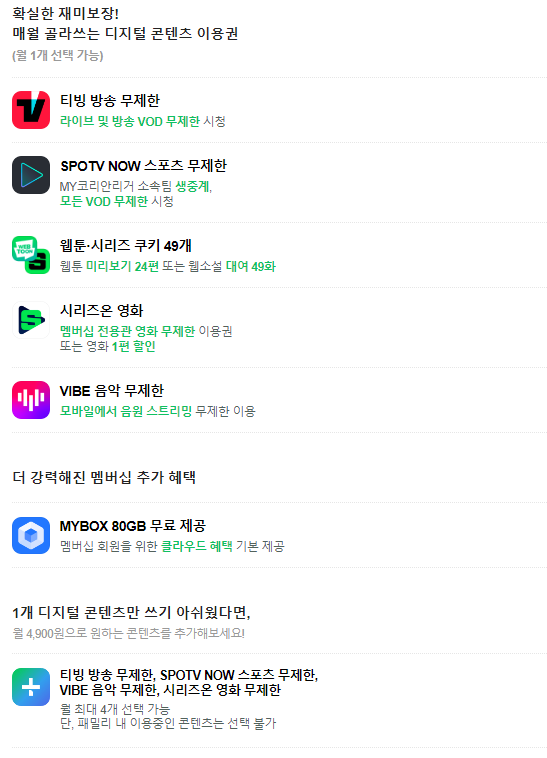 다만.. 이 디지털곤텐츠 혜택은 무제한이라고 써져있는 홍보와 달리 제약이나 제휴사의 정책에 따라 추가 결제를 해야만 이용할 수 있는 경우가 더러 있습니다. 반드시 디지털 콘텐츠 선택시에 설명을 상세히 읽어보시고 결정하시길 바랍니다.