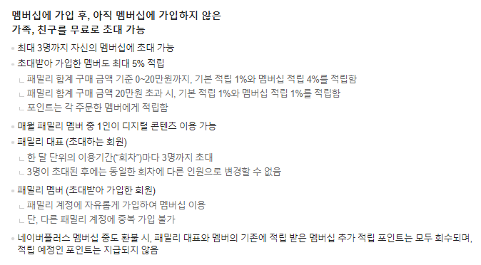 위의 설명과 같이 나 의외에 다른 이용자 3명을 추가하여 쇼핑 적립 혜택을 누리게 해줄 수 있습니다. 이때 적립금은 각자 적립 됩니다. 그런데 혼자든 패밀리든 월 결제금액이 20만원 초과 구간부터 적립혜택이 +1%로 축소되는 것은 동일합니다. 따라서 패밀리들의 월 결제금액 규모에 따라서 따로 멤버십 가입을 할지, 패밀리로 등록할지 결정하시면 되겠습니다.